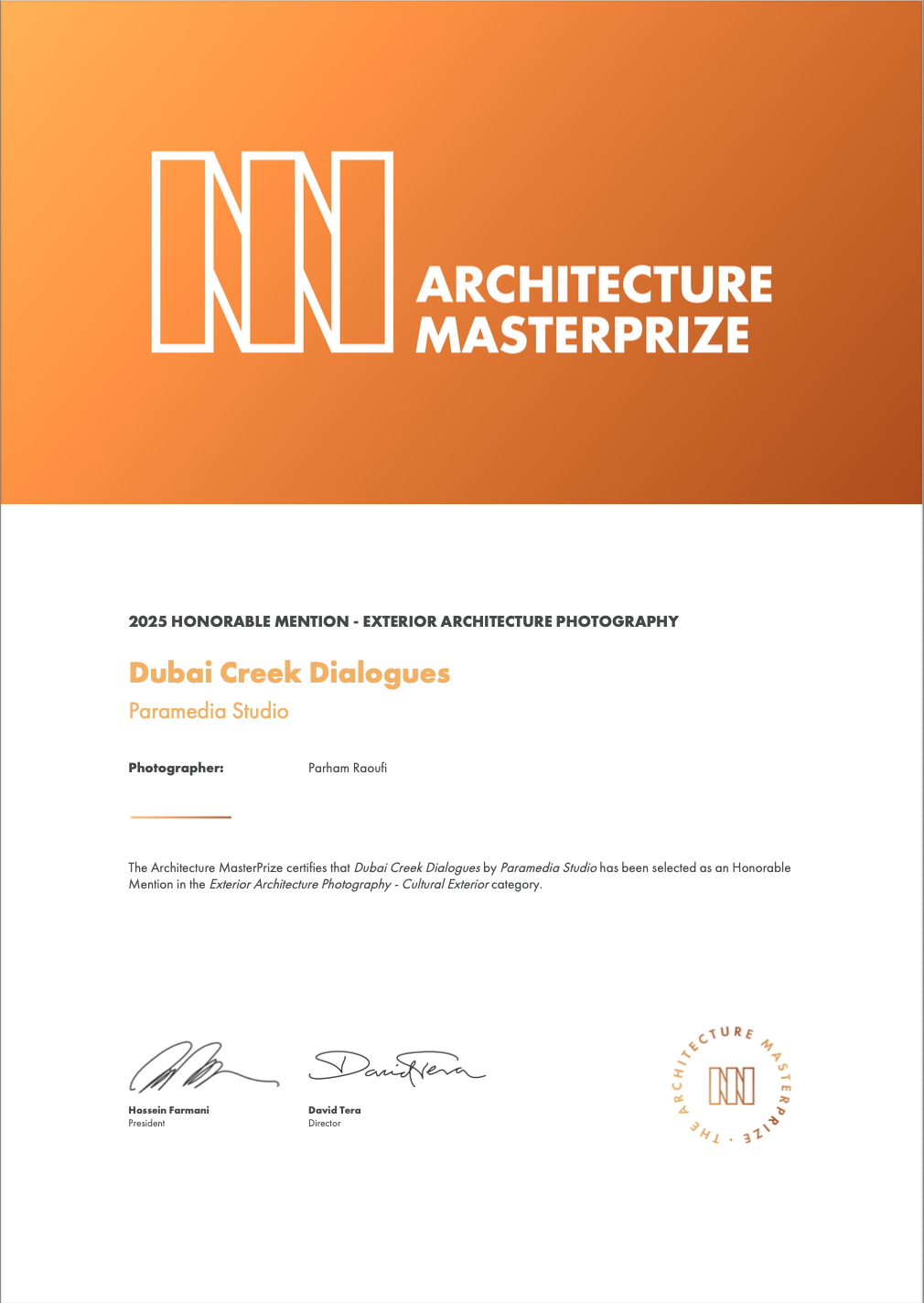My work has been featured on ArchDaily and has received international peer recognition, including three Honorable Mentions at the Architecture MasterPrize 2025 (USA). From documenting the heritage-rich corridors of Al Seef to capturing the modern ambition of projects like Mirdif Avenue Mall, my focus remains on bridging the gap between design and storytelling.